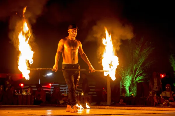 Upon arrival at the authentic Al Shamshi Bedouin Camp, the cultural exploration begins: you’ll be greeted with welcome refreshments (like Arabic coffee and Legaymat), can witness traditional Arabic bread being cooked fresh on the spot, and get intricate Henna art applied. During the winter, enjoy the live Falcon show and take free photos with a falcon display! The evening’s excitement continues with dynamic Cultural Stage Performances like the Saidi and Dabke. After enjoying the shows, prepare for your delicious Gourmet Dinner: a comprehensive BBQ buffet dinner featuring a wide selection, including open grill beef and chicken choices, alongside a variety of vegetarian options. You can enjoy Shisha smoking freely in the public area or pay an extra charge to have it set up at your table. The night’s entertainment crescendos with Spectacular Stage Shows—the mesmerizing Tanoura, Fire, and Belly dance performances—with desserts served immediately following the Fire and Belly dance shows.
